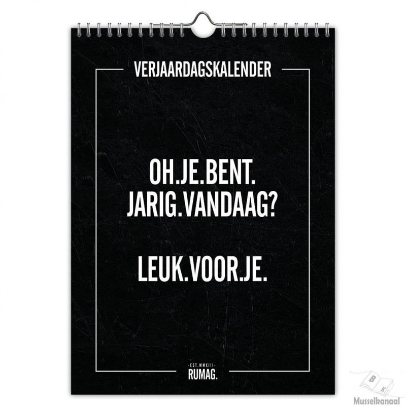 Vergeet met deze verjaardagskalender nooit meer de verjaardag van je moeder, vriend(in) en je hond door lekker ouderwets deze verjaardagskalender aan de wc deur vast te spijkeren. Ook leuk om cadeau te geven. Elke maand een leuke RUMAG. quote, met ringband en ophangoog.
